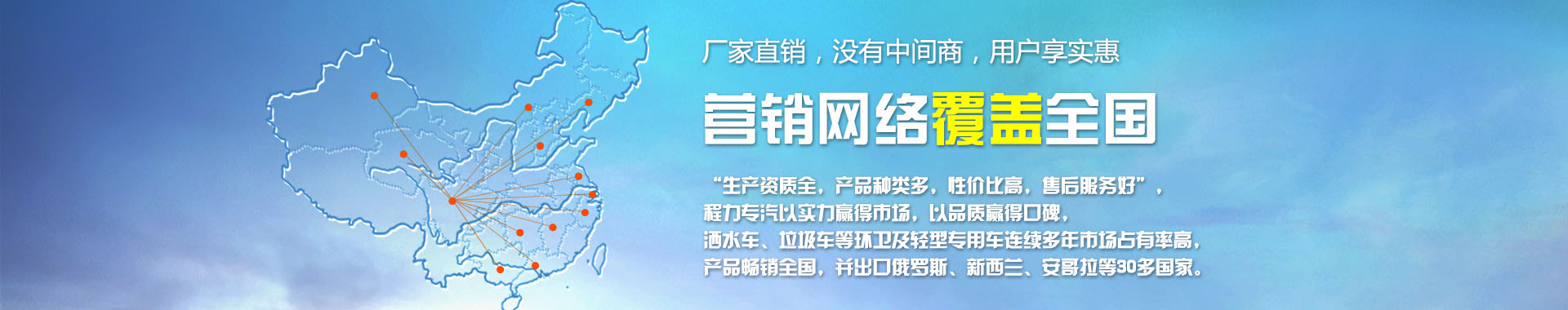 我公司致力于開發(fā)生產(chǎn)銷售專用汽車為已任,為您量身打造方便實用,耐用的專用汽車,其主導(dǎo)品種有園林綠化灑水車、環(huán)衛(wèi)灑水車、油罐加運油車、吸糞車、吸污車、擺臂、掛桶、密封式垃圾車、廂式運輸車、消防車、半掛車、自卸車、水泥車、隨車吊等八大系列100多個品種300多個車型。同時批發(fā)東風(fēng)、解放、福田等各種二類底盤。目前我公司銷售網(wǎng)絡(luò)基本已覆蓋全國各地,具體如下。